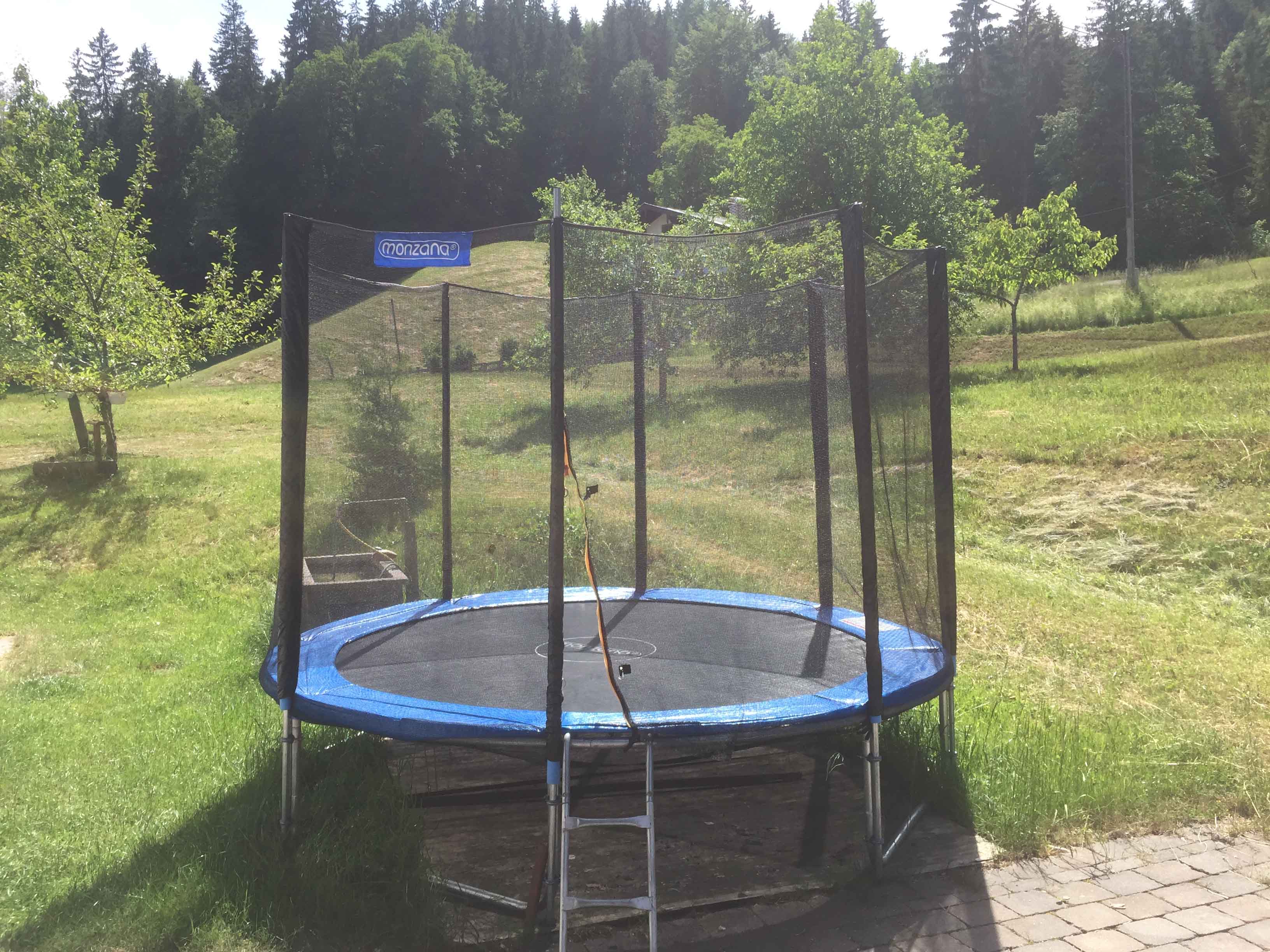 Zum Haus gehört ein Kinderspielplatz mit Trampolin, Rutsche und Schaukeln. Auf